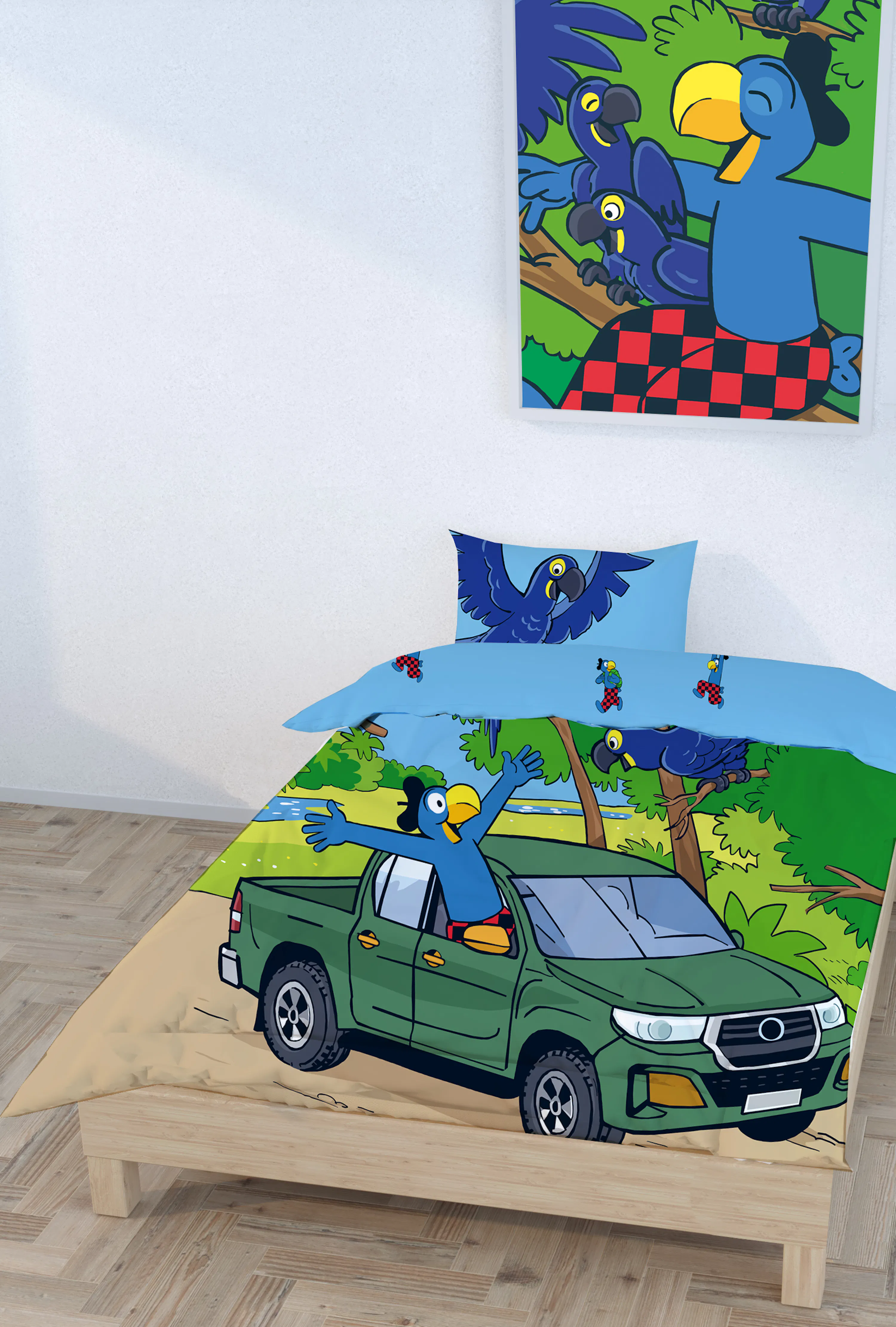 Das lebendige Motiv zeigt Globi auf grosser Fahrt im Geländewagen, umgeben von neugierigen Papageien mitten in einer bunten Naturlandschaft. Die farbenfrohe Gestaltung bringt sofort gute Laune ins Schlafzimmer und lädt zum Träumen ein. Genau richtig für kleine und grosse Globi-Fans, die es verspielt, gemütlich und voller Entdeckergeist mögen.