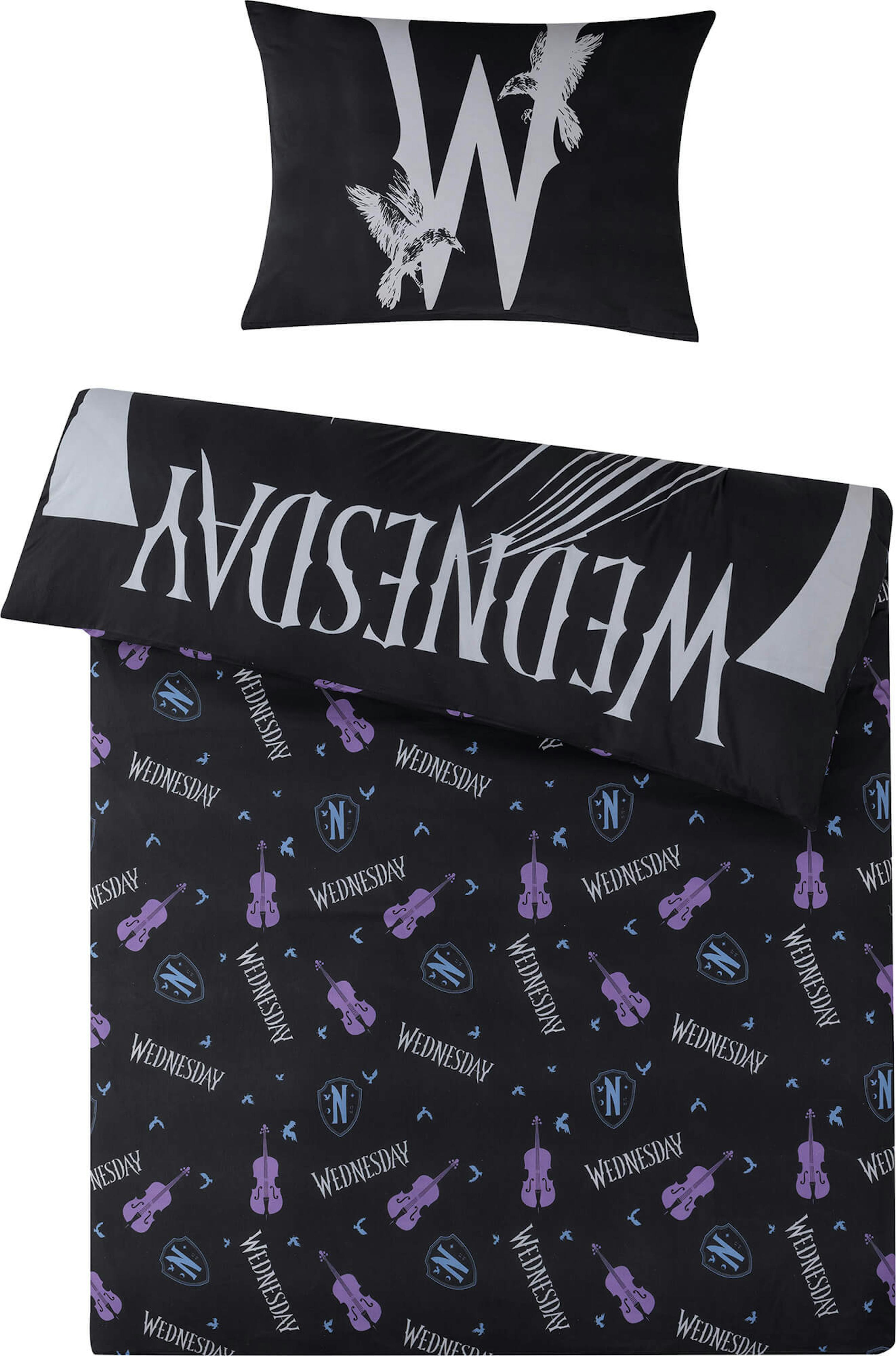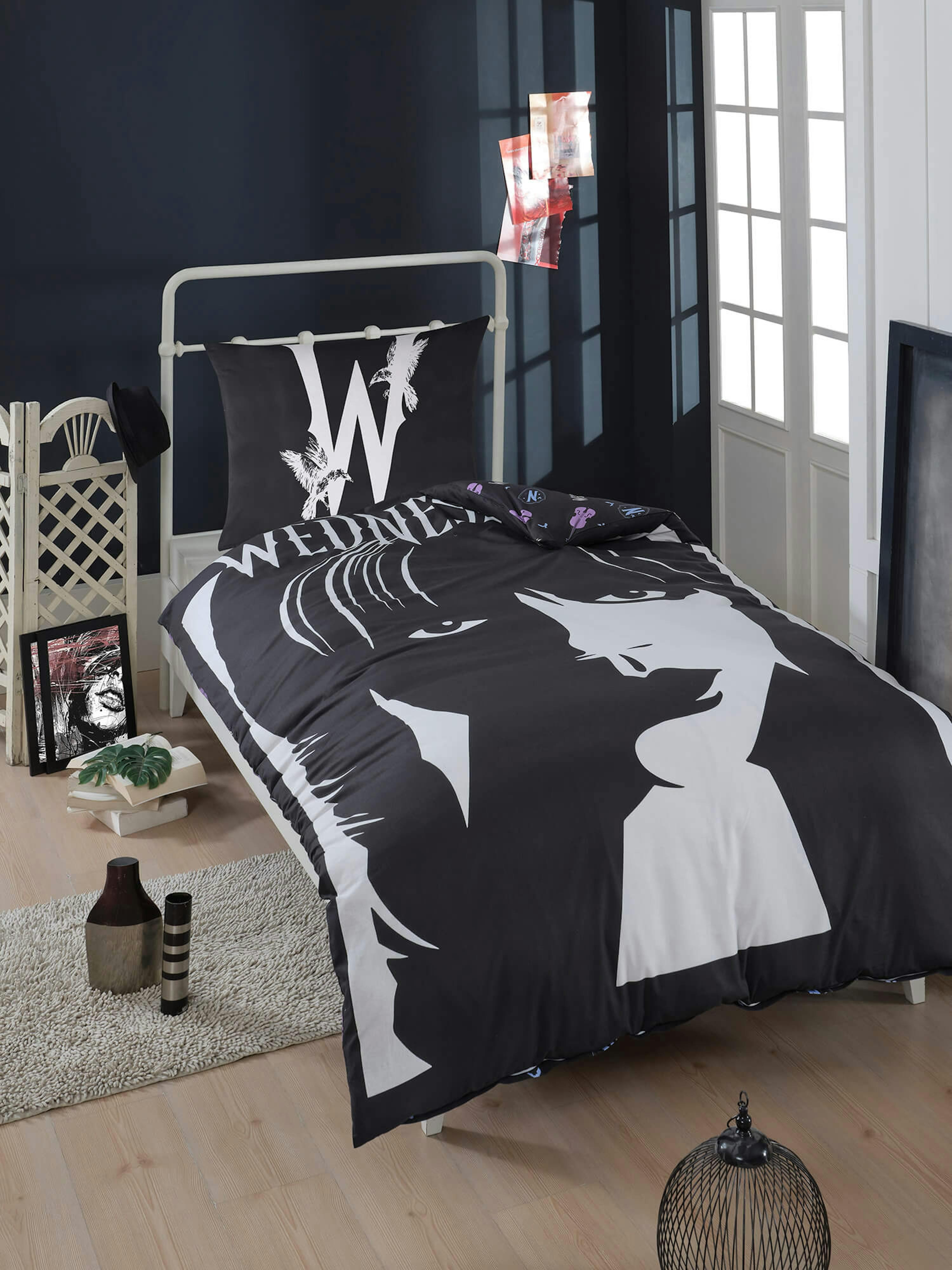 Das Design ist inspiriert von der düsteren und mysteriösen Stimmung der Serie und zeigt ein markantes Bild von Wednesday Addams in Schwarz-Weiss. Der Bettbezug ist mit dem Schriftzug «WEDNESDAY» versehen und hebt sich durch das minimalistische und kontrastreiche Design hervor. Der Kissenbezug ergänzt das Set mit einem grossen „W“ und stilisierten Rabenmotiven, die perfekt zur Atmosphäre der Serie passen.
