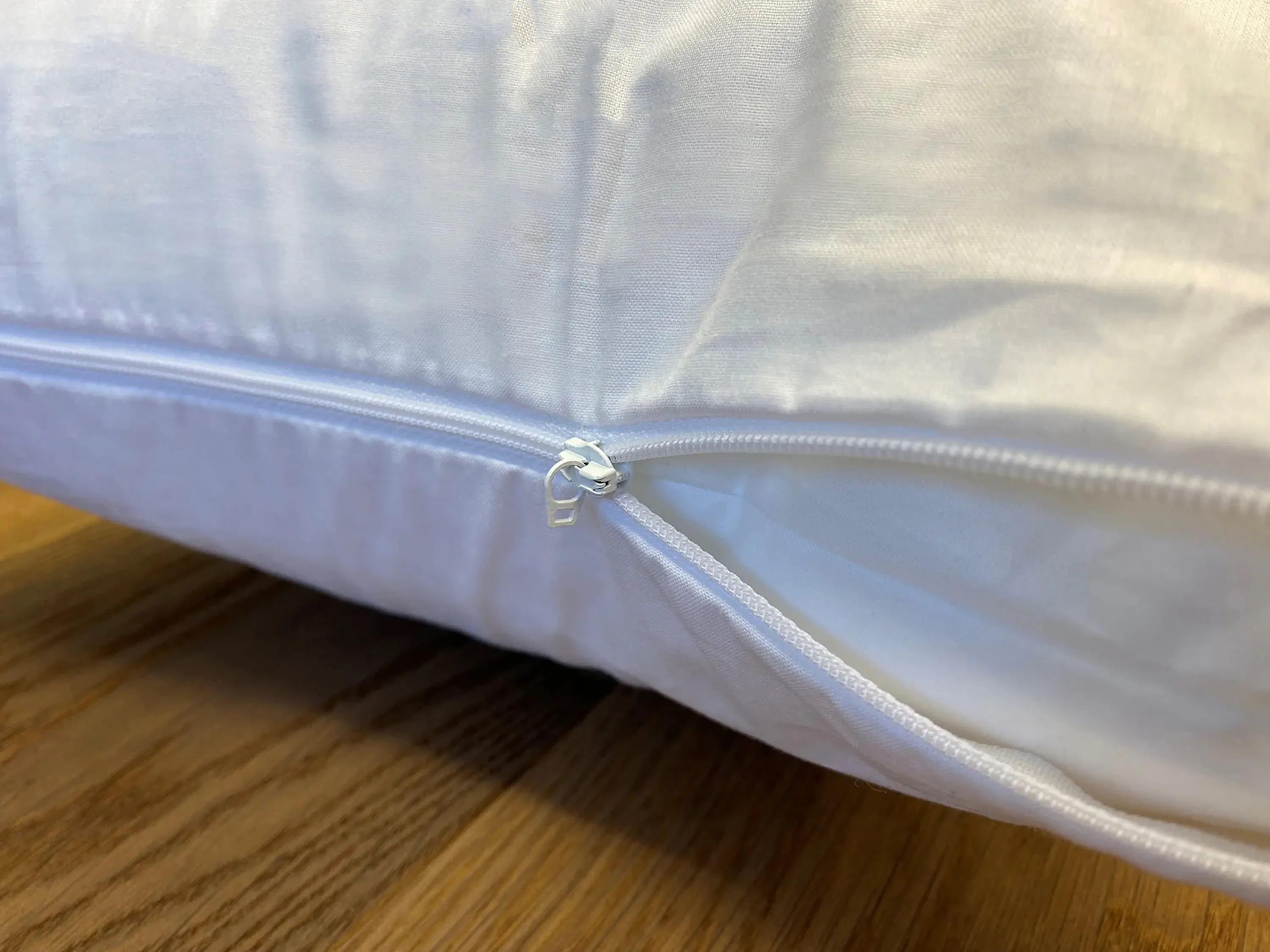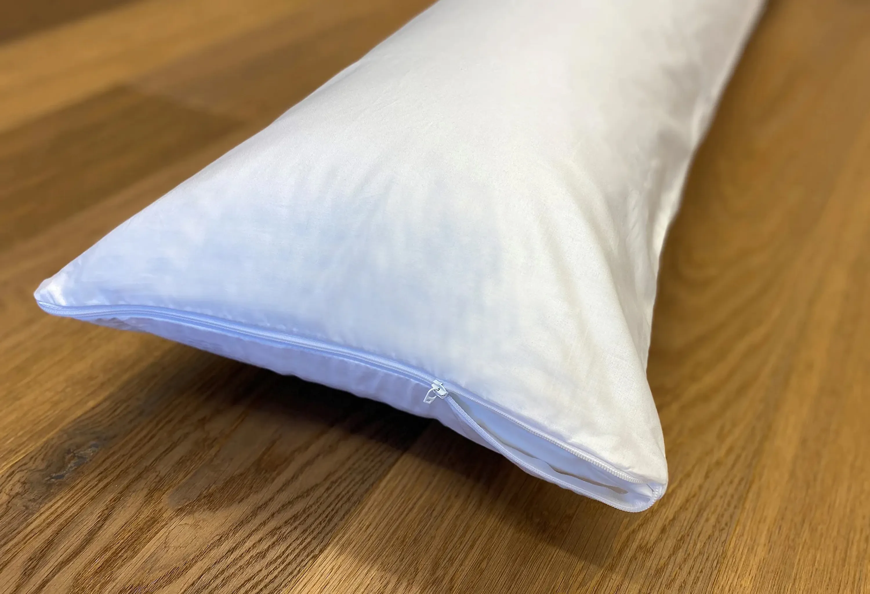 Weisser Baumwoll-Bezug für das HEFEL Seitenschläferkissen. Er schützt das Seitenschläferkissen vor Verunreinigungen und kann in der Waschmaschine gereinigt werden.