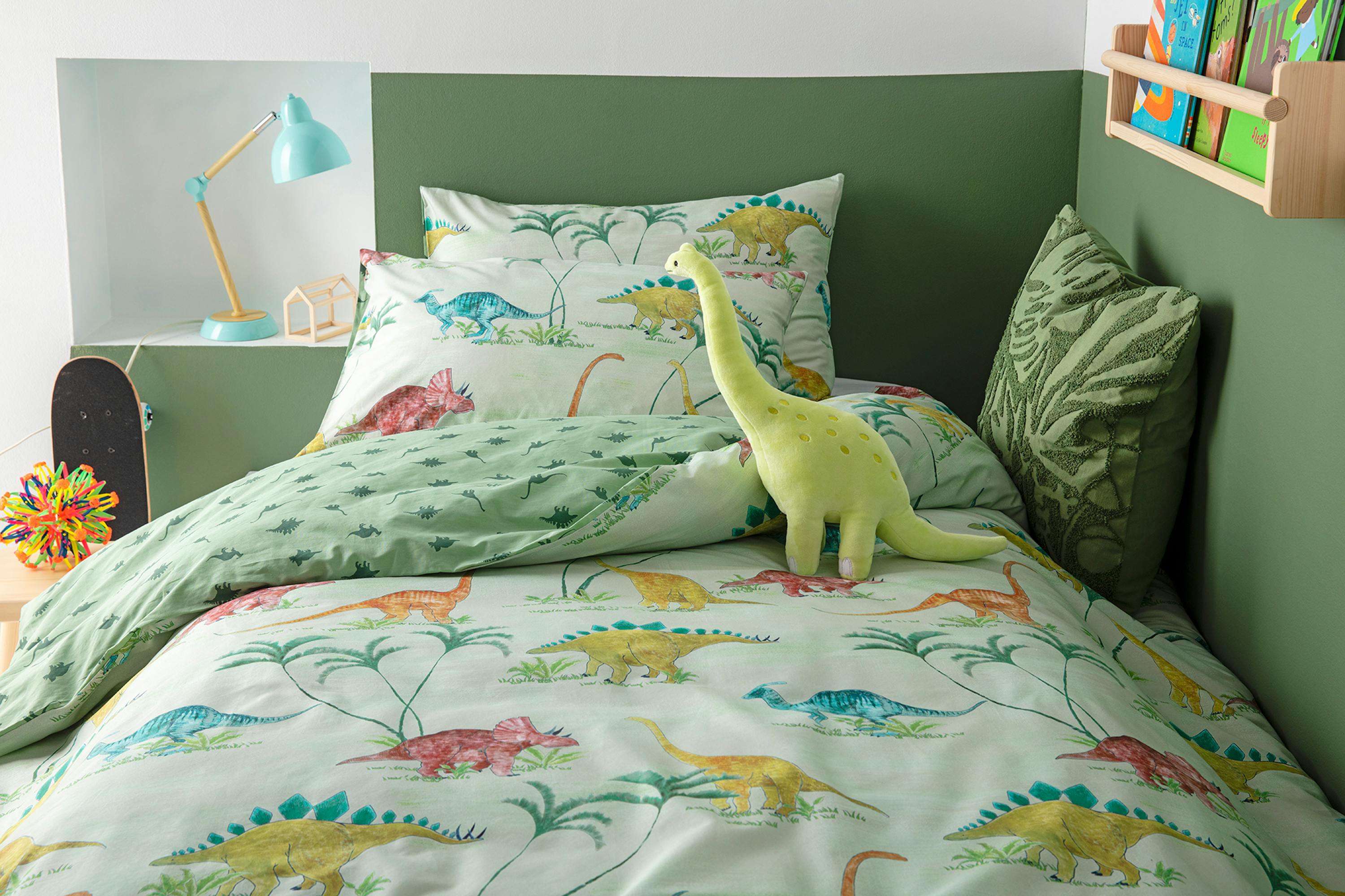 Mit der KAS-Bettwäsche «Dinosaurier» wird das Kinderzimmer im Handumdrehen zur abenteuerlichen Urzeitwelt! Fröhliche Dino-Motive wie T-Rex und Stegosaurus sorgen für Entdeckerstimmung im Bett – perfekt für neugierige Kids mit Fantasie.
