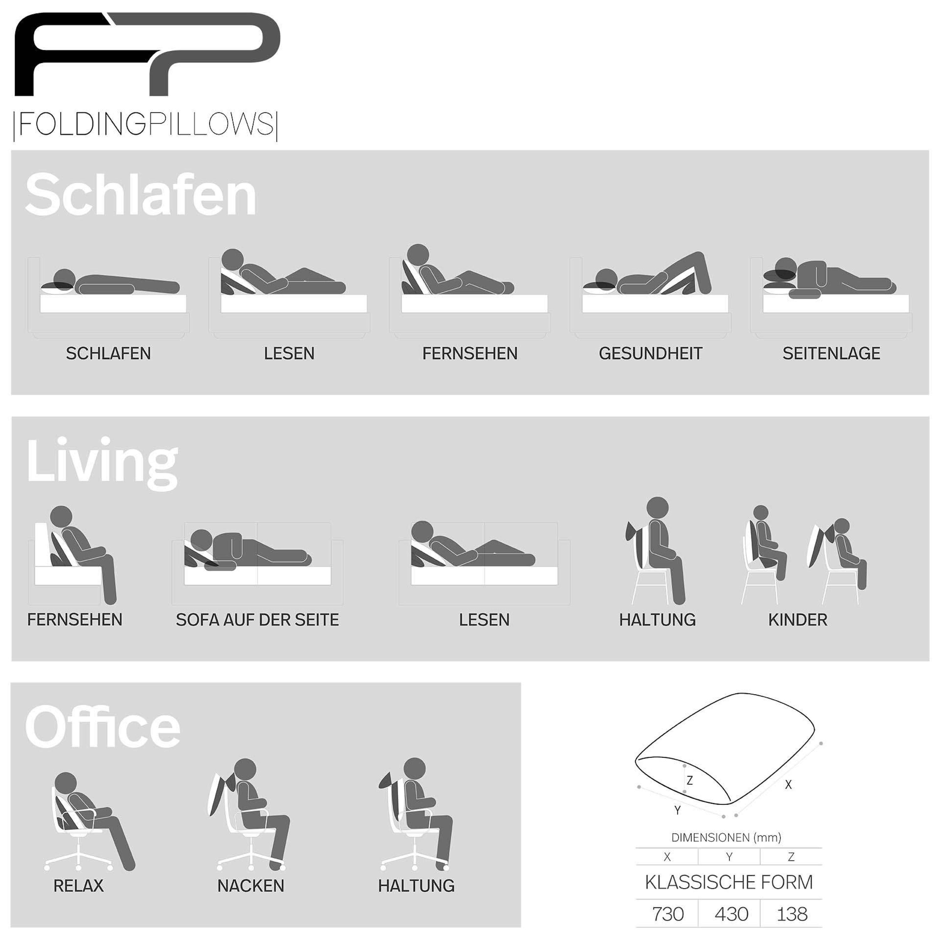 Beim Gebrauch des Lotus Folding Pillows merken Sie rasch, dass es sich hierbei nicht um ein klassisches Kissen handelt. Das Lagerungskissen findet im Schlafzimmer, im Büro und auf dem Sofa seinen Nutzen. Ganz egal ob Sie schlafen, lesen, fernsehen oder einfach nur entspannen. Mit einem einfachen Handgriff ist das Multifunktionskissen gefaltet und entlastet nach Wahl die Beine, den Nacken oder den Rücken. So werden gemütliche Stunden noch angenehmer und die Entspannung gefördert. Selbstverständlich kann das Kissen auch unterwegs genutzt werden.