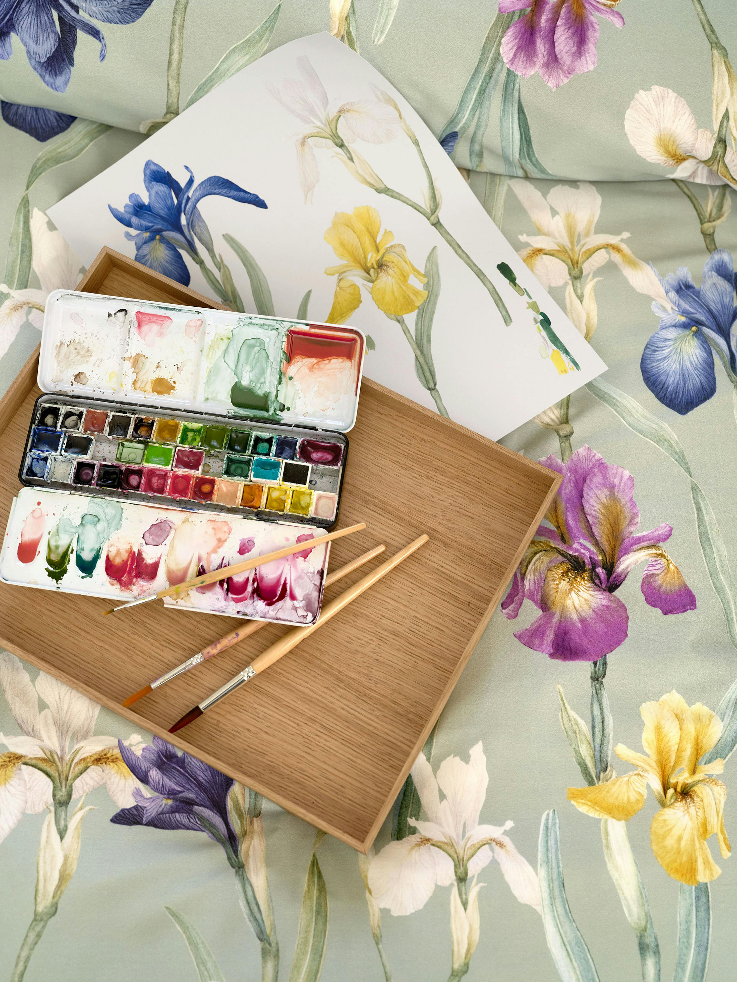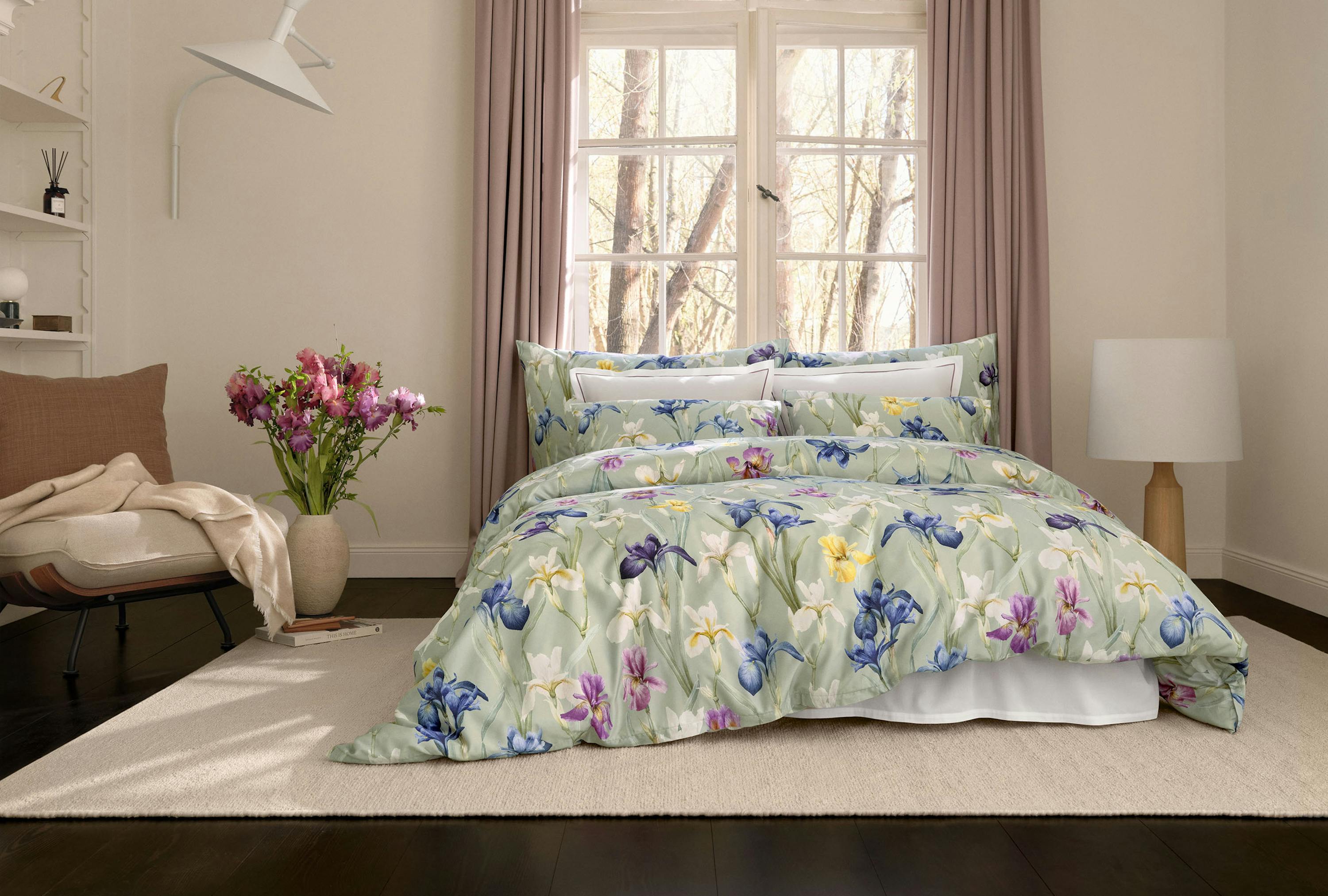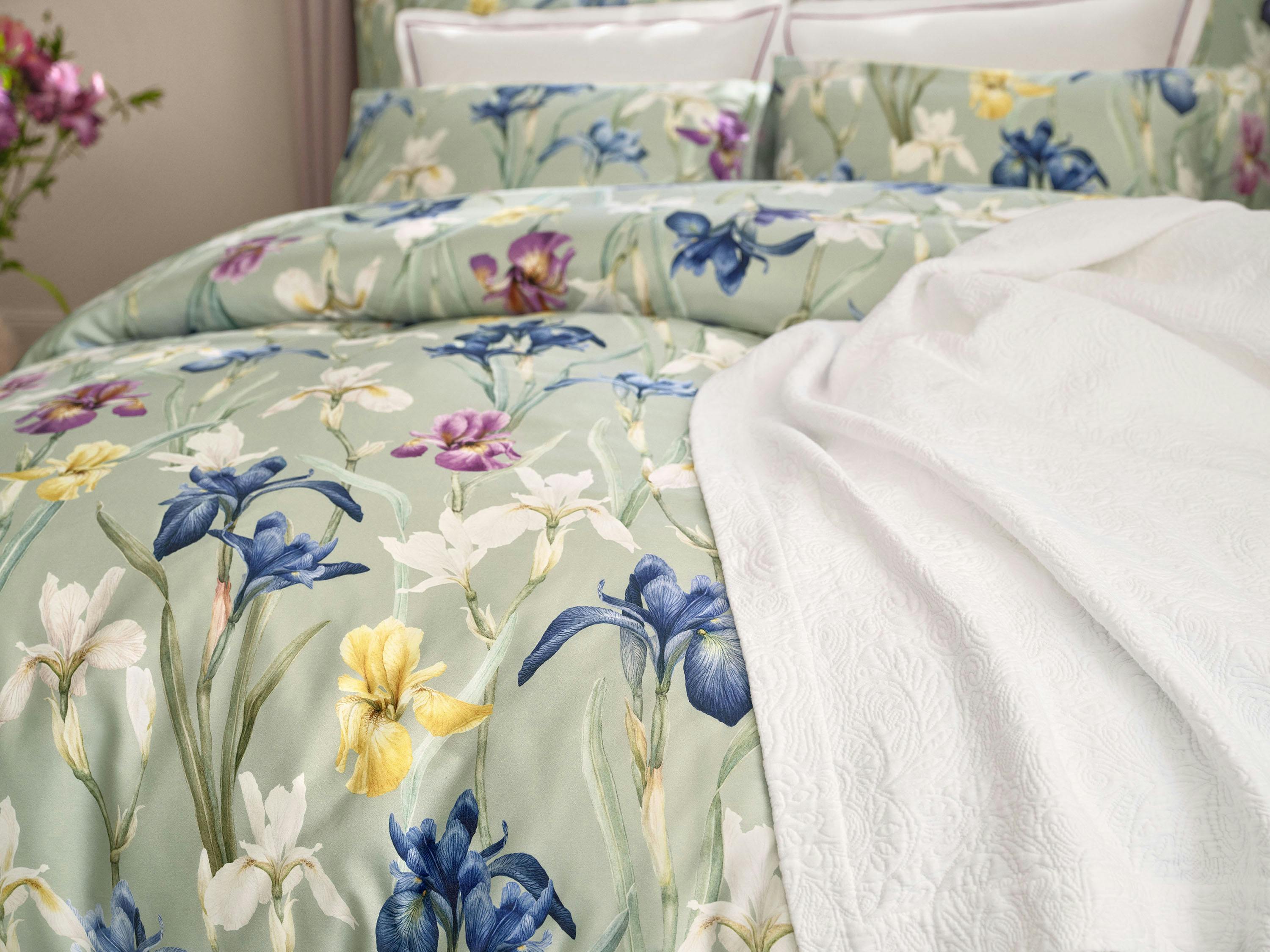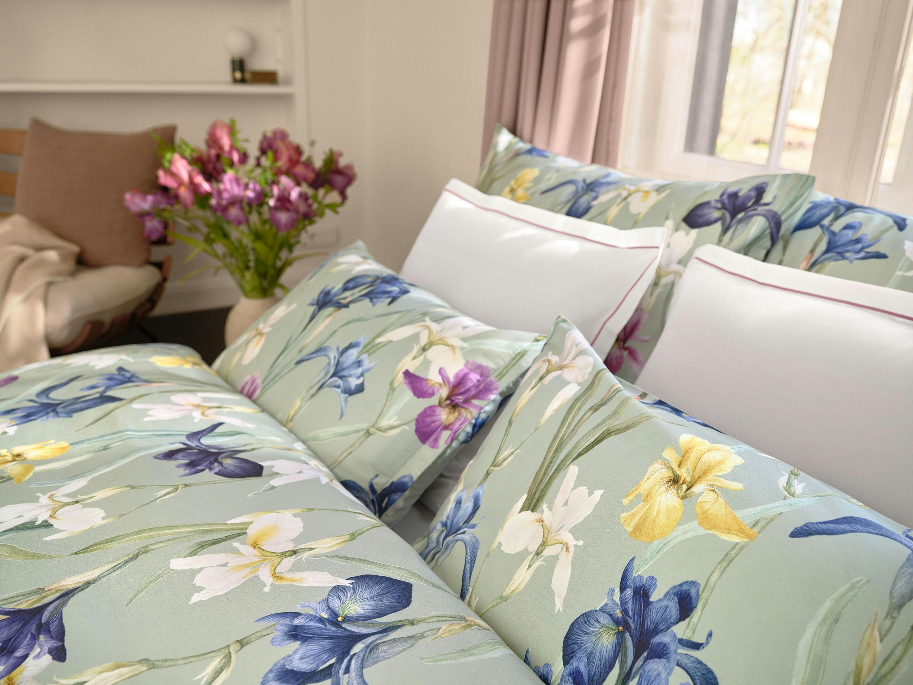 Das Design CHARLOTTE lädt Sie dazu ein, in Ihren eigenen Traumwelten durch eine fast unendliche Wiese voll blühender Schwertlilien zu schreiten. Mit Bewunderung und Hingabe neigen sich die Blütenköpfe auf der Satin-Bettwäsche zu- und voneinander, während sich das Blattwerk im Hintergrund auf den salbeigrünen Fond bettet. Die dunklen und teils kräftig gefärbten Blüten aus Aquarellfarben in samtigem Nachtblau bis Violett, goldenem Gelb und Elfenbein spielen sich in den Vordergrund und geniessen all Ihre Aufmerksamkeit.