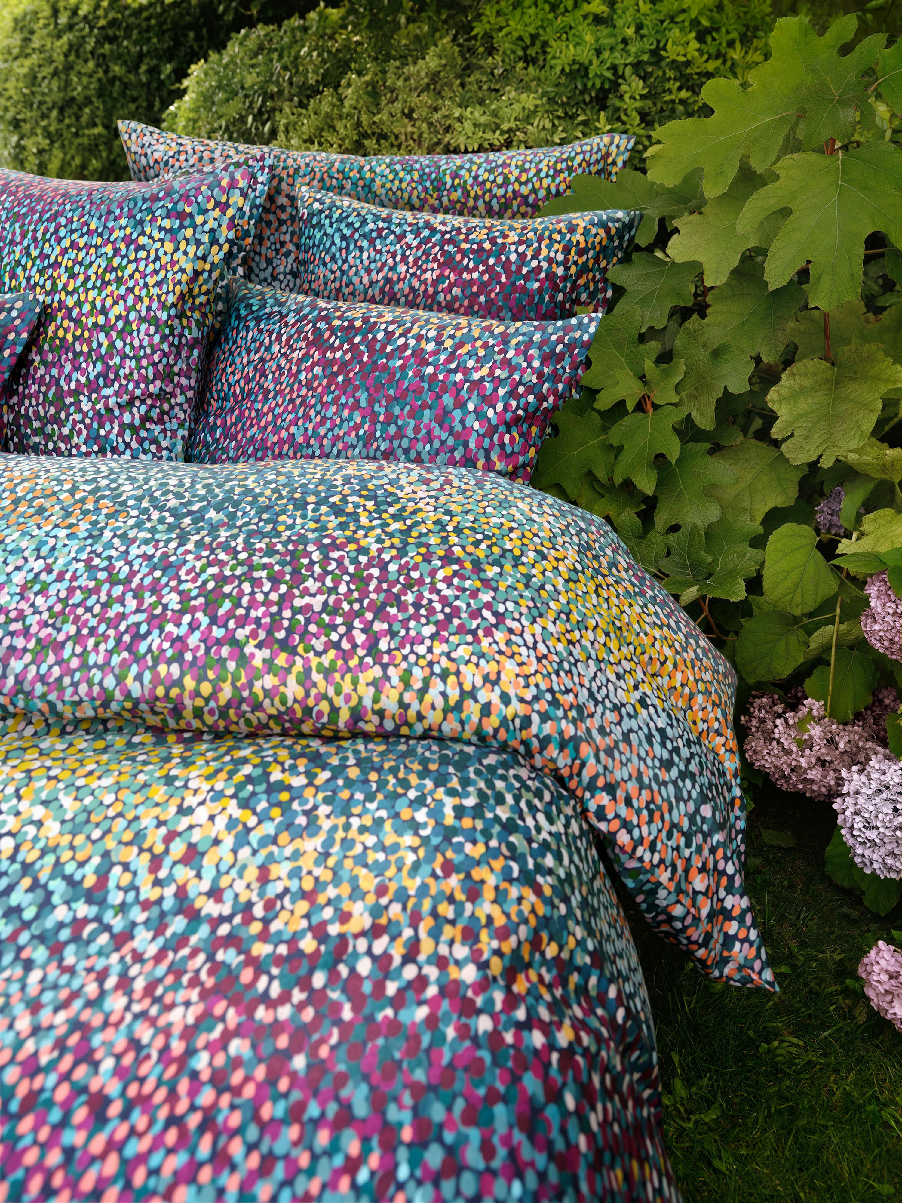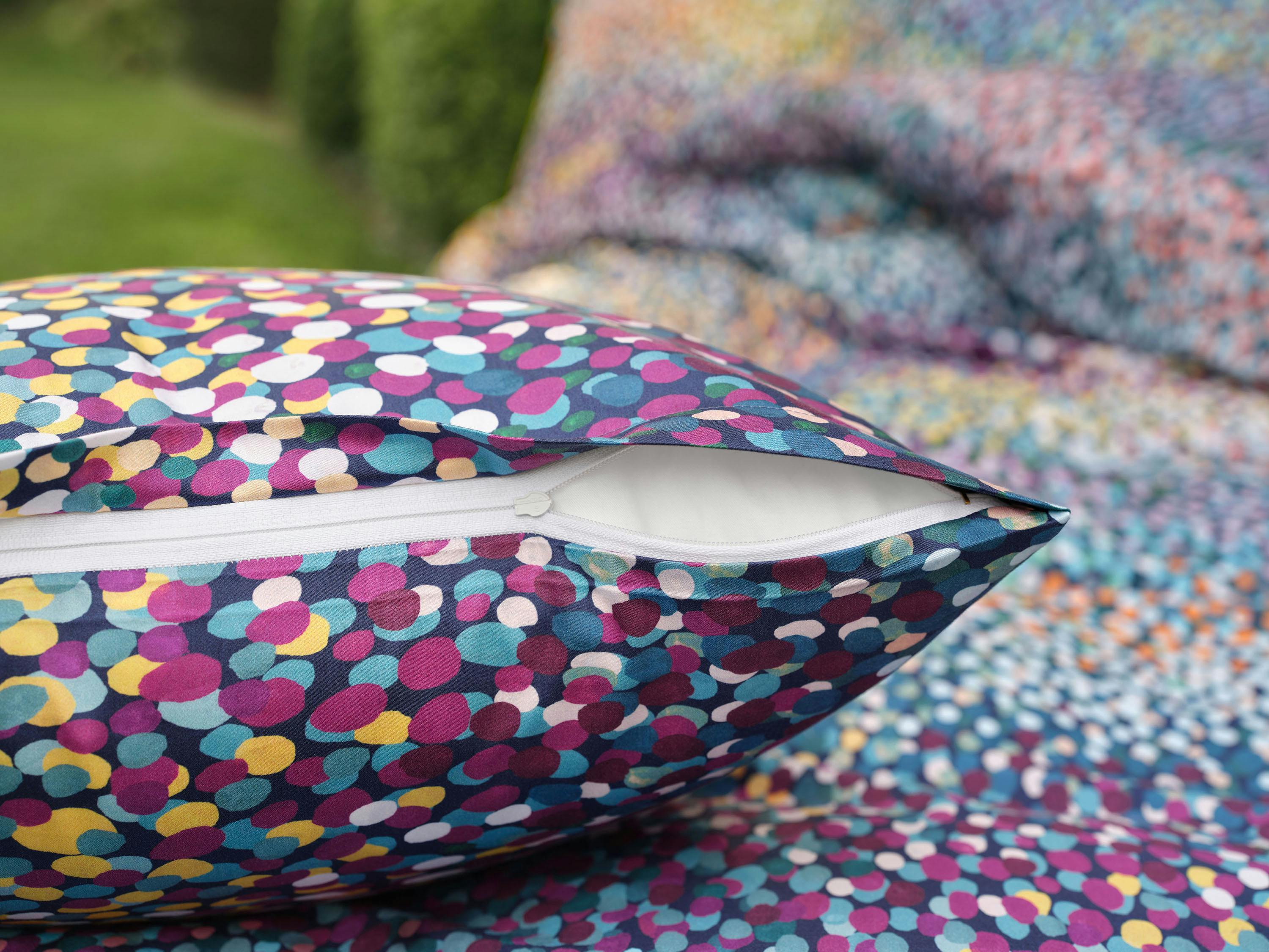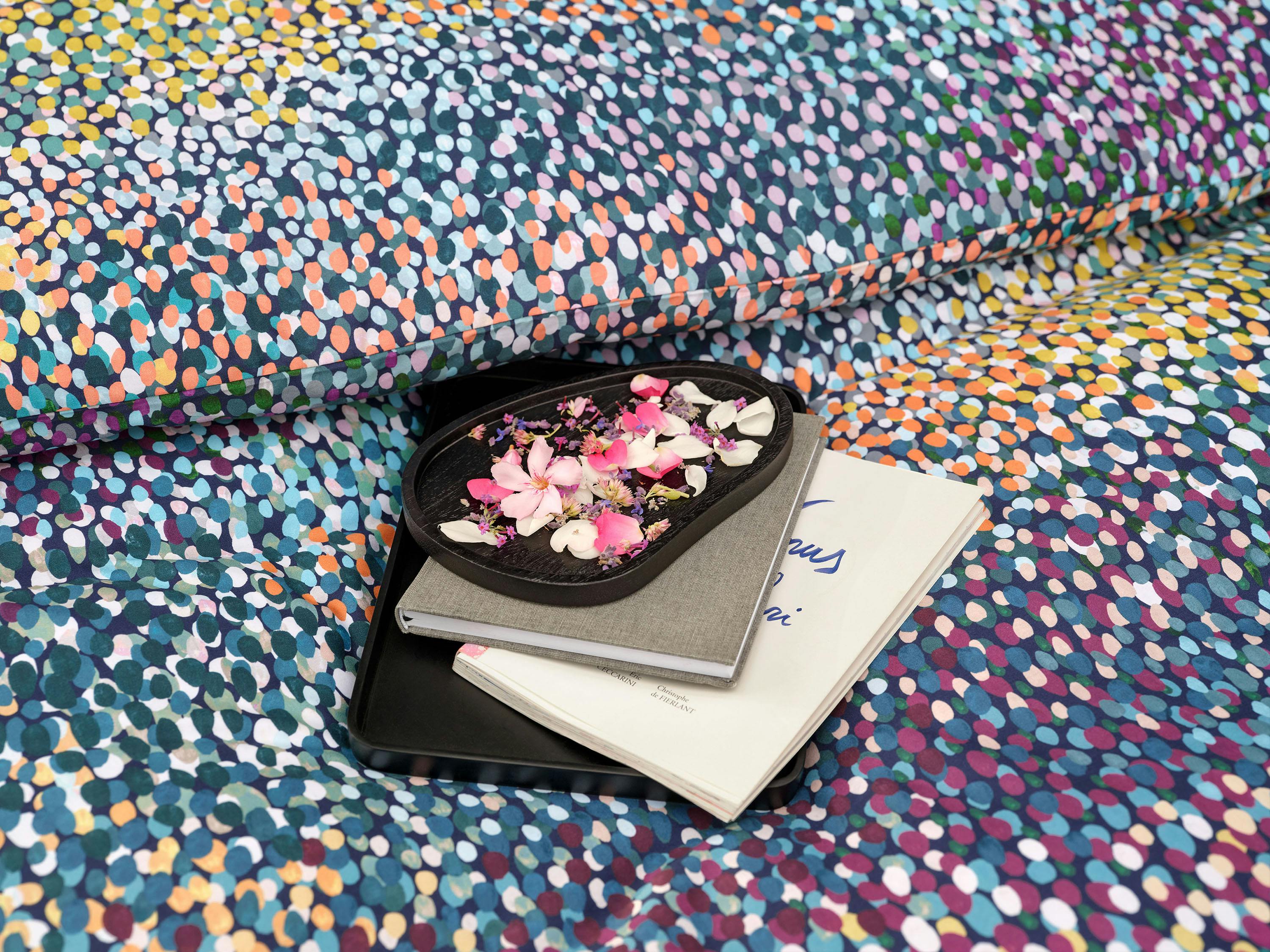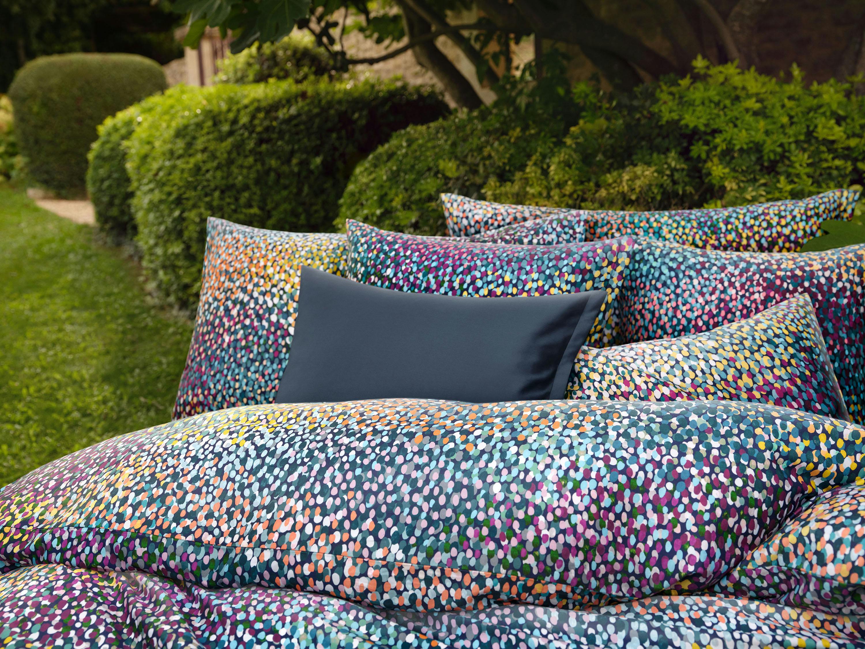 Inspiriert von pointillistischen Gemälden oder auch dem Anblick einer blühenden Sommerwiese aus luftigen Höhen zieht die Bettwäsche JANA fast unwiderstehlich in ihren Bann und lädt dazu ein, in dieses berauschende Meer aus Farbtupfern einzutauchen. Zahlreiche Nuancen aus goldenem Ocker, samtigem Veilchenblau, silbernem Grau, Blau- und Grüntönen wollen von Nahem entdeckt werden und laden in den herrlich blühenden Garten ein – aufgetragen in Handarbeit und in mehreren Schichten entsteht auf dem leuchtend, dunkelblauen Hintergrund das organische, lebendige Design in Gouache.