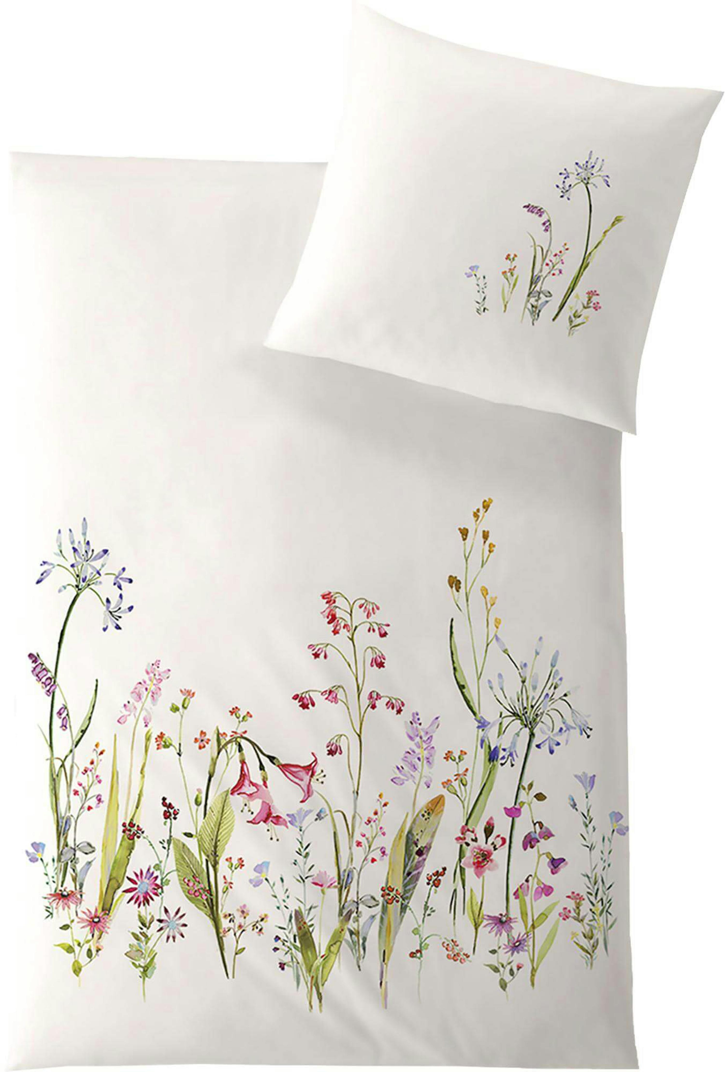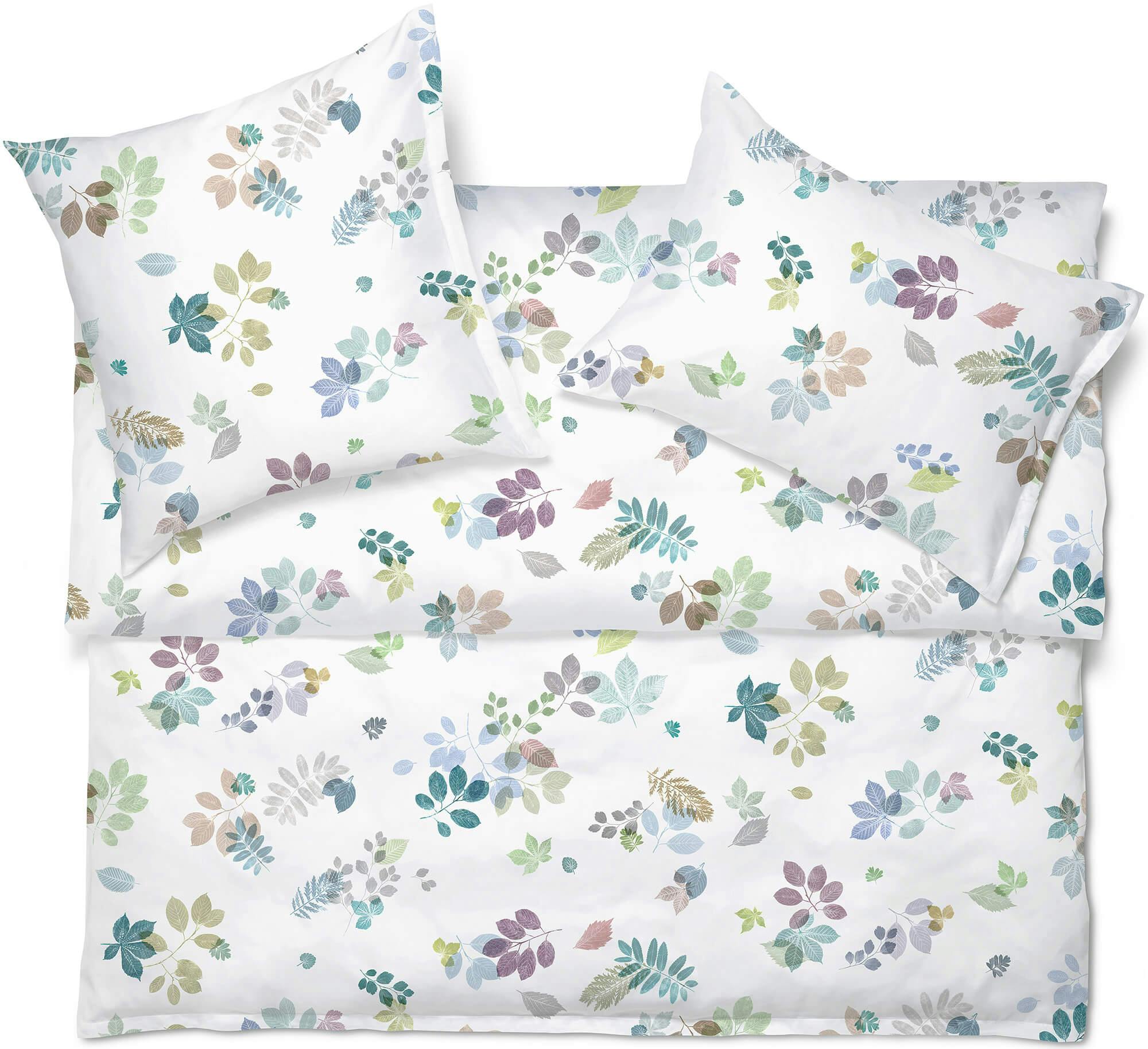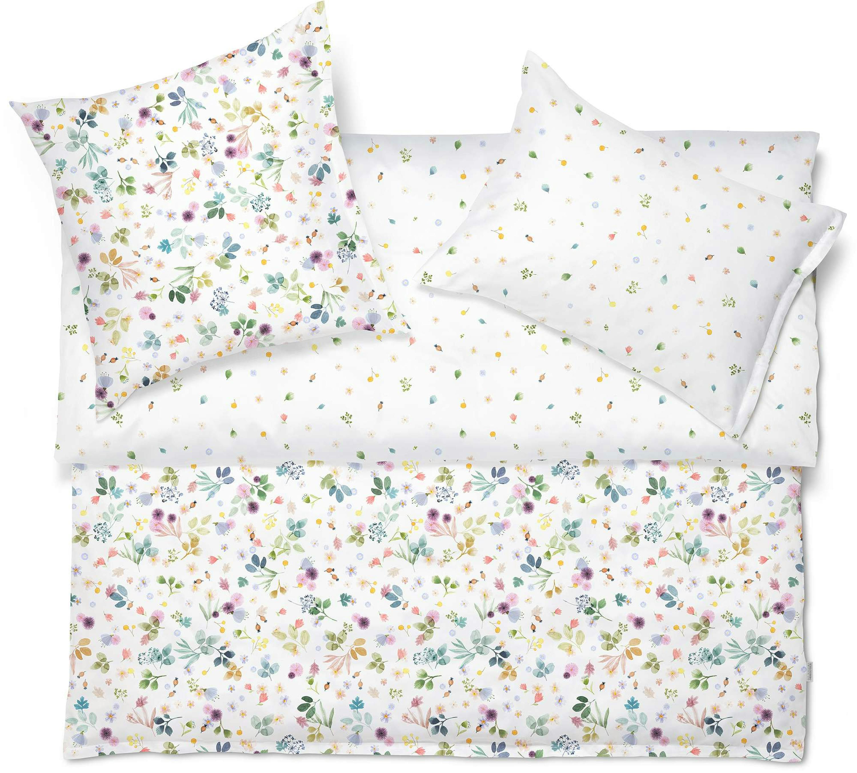 Scheint dieser feine Strauss an Blüten und Blättern im ersten Moment zufällig über den reinweissen Satin gestreut, bildet sich beim nächsten Windstoss schon ein herbstlicher Reigen, der an die Leichtigkeit des Spätsommers erinnert. Die verspielte Schlossberg Wende-Bettwäsche YLVIE ist zum Teil ganz der Fantasie entsprungen, zum Teil angelehnt an die Natur.