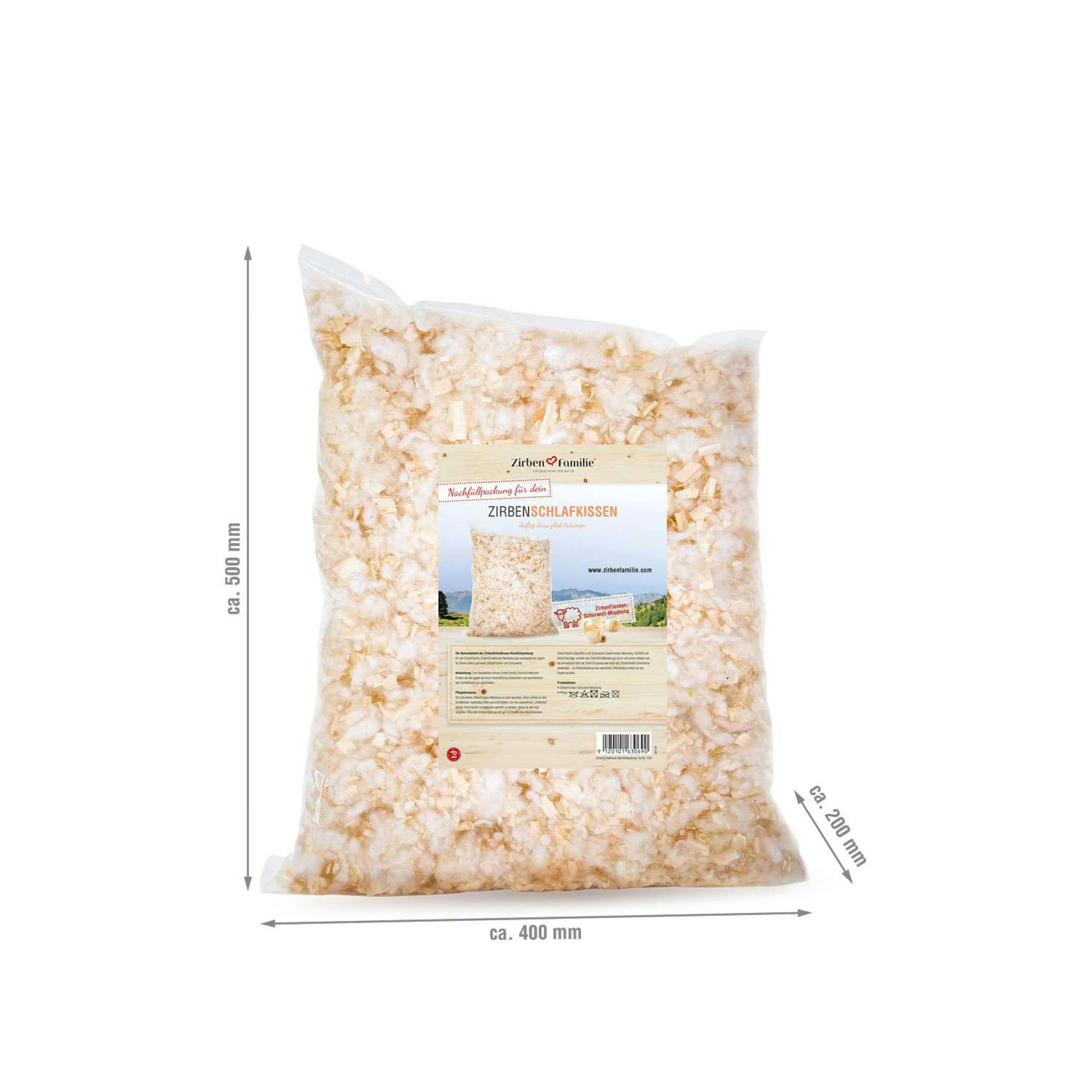 Angenehm duftende Zirbenflocken gemischt mit kuscheliger und atmungsaktiver Schurwolle. Die Zirbenflocken Nachfüllpackung mit Schurwolle der Zirbenfamilie eignet sich perfekt für den Austausch von älterem Füllmaterial oder zur Herstellung eines eigenen Schlaf- bzw. Dekokissens.